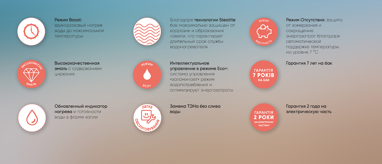 ECO+ — «умная» функция, анализирует ваш ритм жизни и сама подбирает оптимальное время и температуру нагрева. Вы не тратите ни лишнего киловатта, ни лишнего времени.