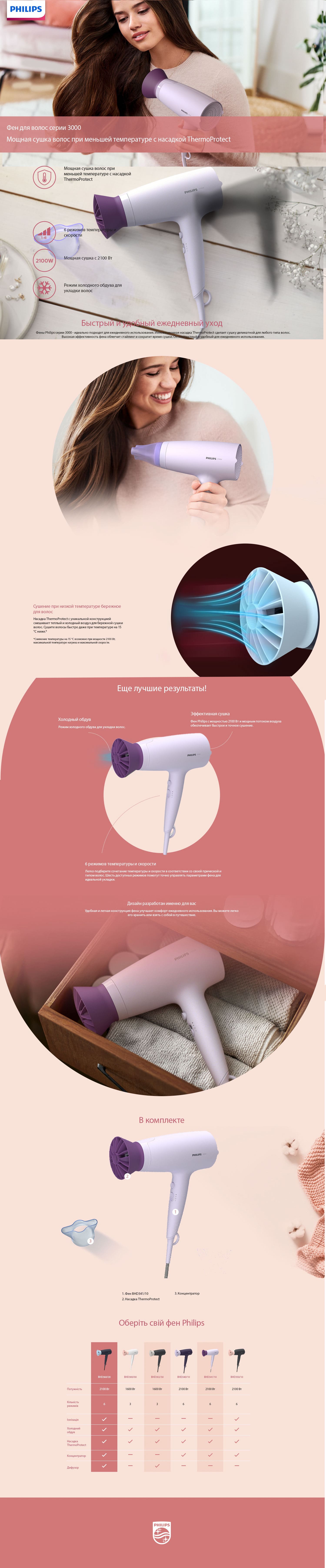Искала лёгкий и компактный вариант, но чтобы при этом оставался мощным. Остановилась на этой модели, и действительно он очень удобный для ежедневного использования. Огромным плюсом стала насадка Thermo Protect, благодаря ей сохраняется естественная влага волос и они остаются здоровыми, даже при ежедневном использовании фена.