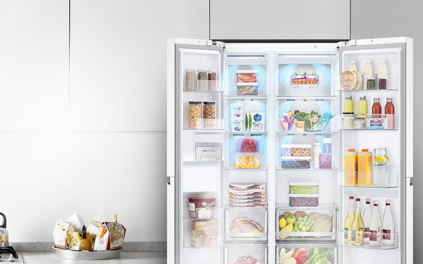 Панель холодного воздуха в верхней части холодильника обеспечивает на 19,7%* более быстрое и равномерное охлаждение, чтобы ваши продукты сохранялись свежими еще дольше.