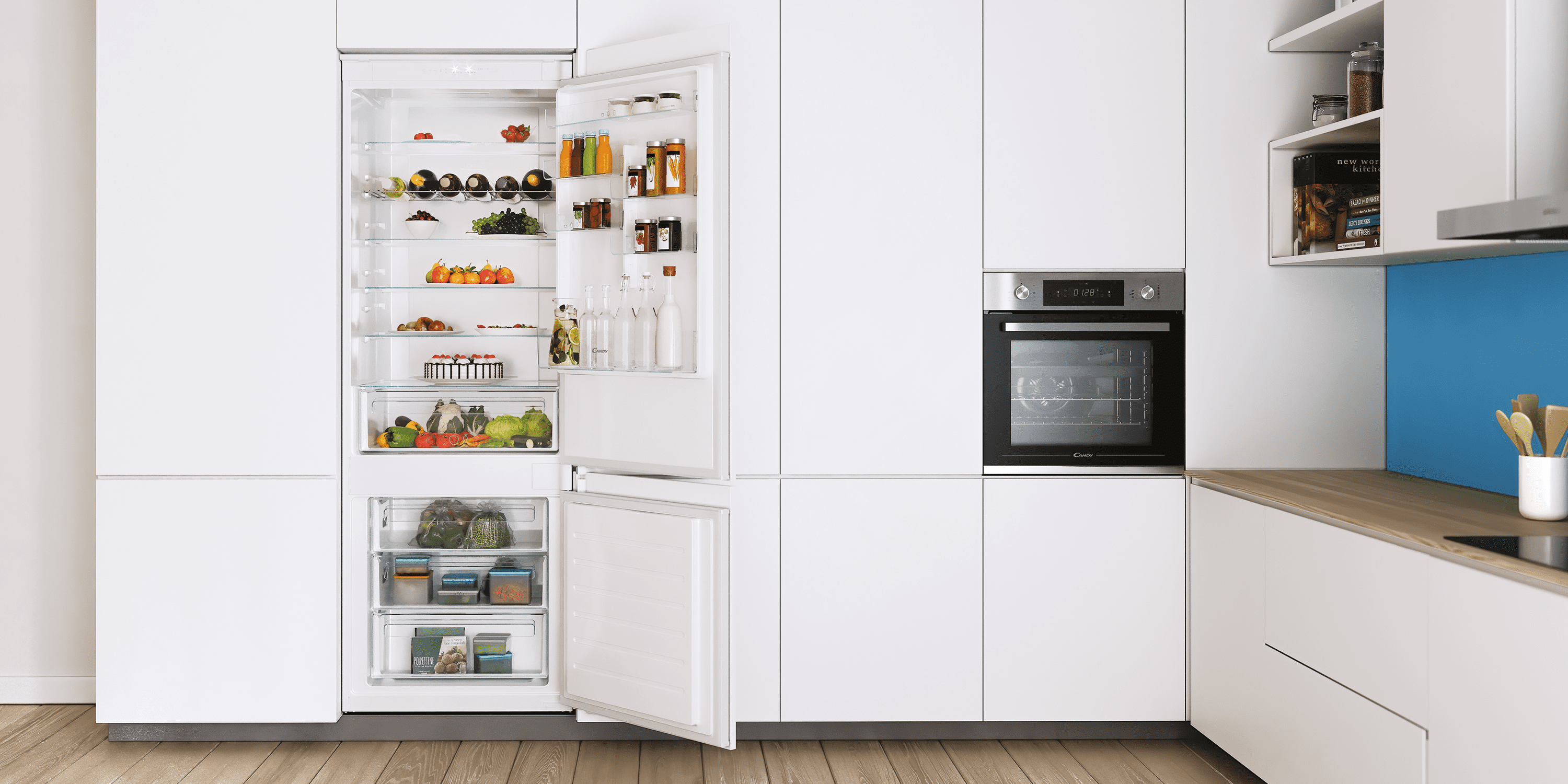 Встраиваемые холодильники Candy Fresco очень вместительны и созданы для соответствия вашему стилю жизни. Благодаря большой вариативности расположения полок у вас будет полная свобода для удобного хранения продуктов, а технология Total No Frost Circle+ сохранит их свежесть как можно дольше. В дополнение, холодильник имеет дистанционное Wi-Fi управление и набор интеллектуальных функций, благодаря которым будет легче справиться с повседневными кухонными заботами. Кроме того, система Candy in-tech и перенавешиваемые дверцы позволяют установить его в любой кухне.