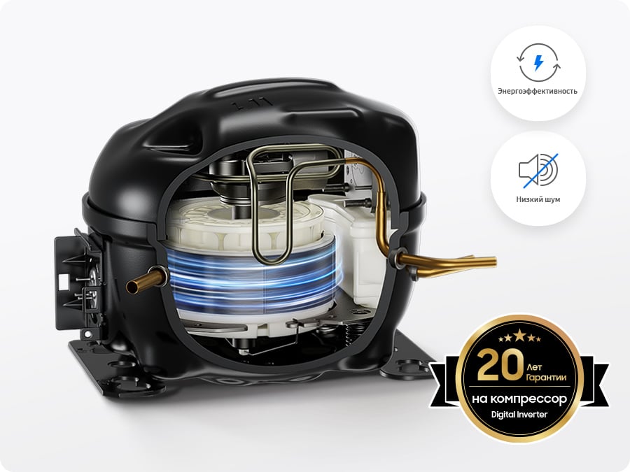 Надежно охлаждает продукты и сберегает энергию. Улучшенная конструкция компрессора с цифровым инвертором увеличивает его инерцию в 4,1 раза по сравнению с существующими компрессорами*, благодаря этому он потребляет меньше энергии, особенно при поддержании постоянной температуры. Гарантийный срок компрессора 20 лет**.