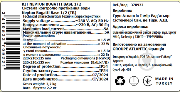 - "370901 Модуль управления Neptun Base (TR) - 1шт, 370917 Кран с электроприводом Neptun Bugatti Pro 220В 1/2 (TR) - 2шт, 370905 Датчик контроля протекания воды SW005 (TR) - 3шт, Паспорт и инструкция по монтажу и использованию - 3шт, Схема подключения приборов к модулю управления - 1шт. Упаковка - 1шт."