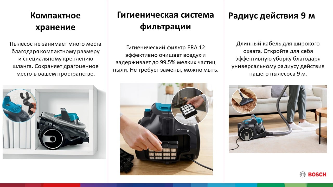 Отличный компактный пылесос, убирает одинаково хорошо на моем ламинате, коврах, мягкую мебель, маленькой турбощеткой отлично получается почистить кресла и диван от шерсти животных. Есть регулировка мощности на корпусе, мотор не будет работать на максимальной мощности там где это не нужно. Ни и больше всего ценю фильтра - можно мыть даже фильтр выхода воздуха, нет необходимости каждый год тратить деньги на покупку новых фильтров.