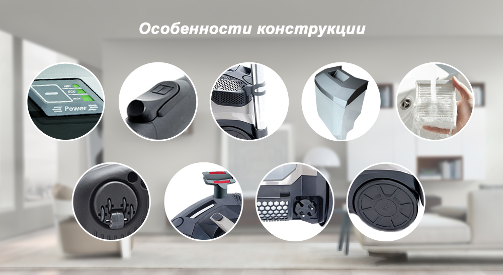 Телескопическая труба изготовлена из нержавеющей стали. В приборе также установлен НЕРА-фильтр (моющийся) и микрофильтр выходящего воздуха.