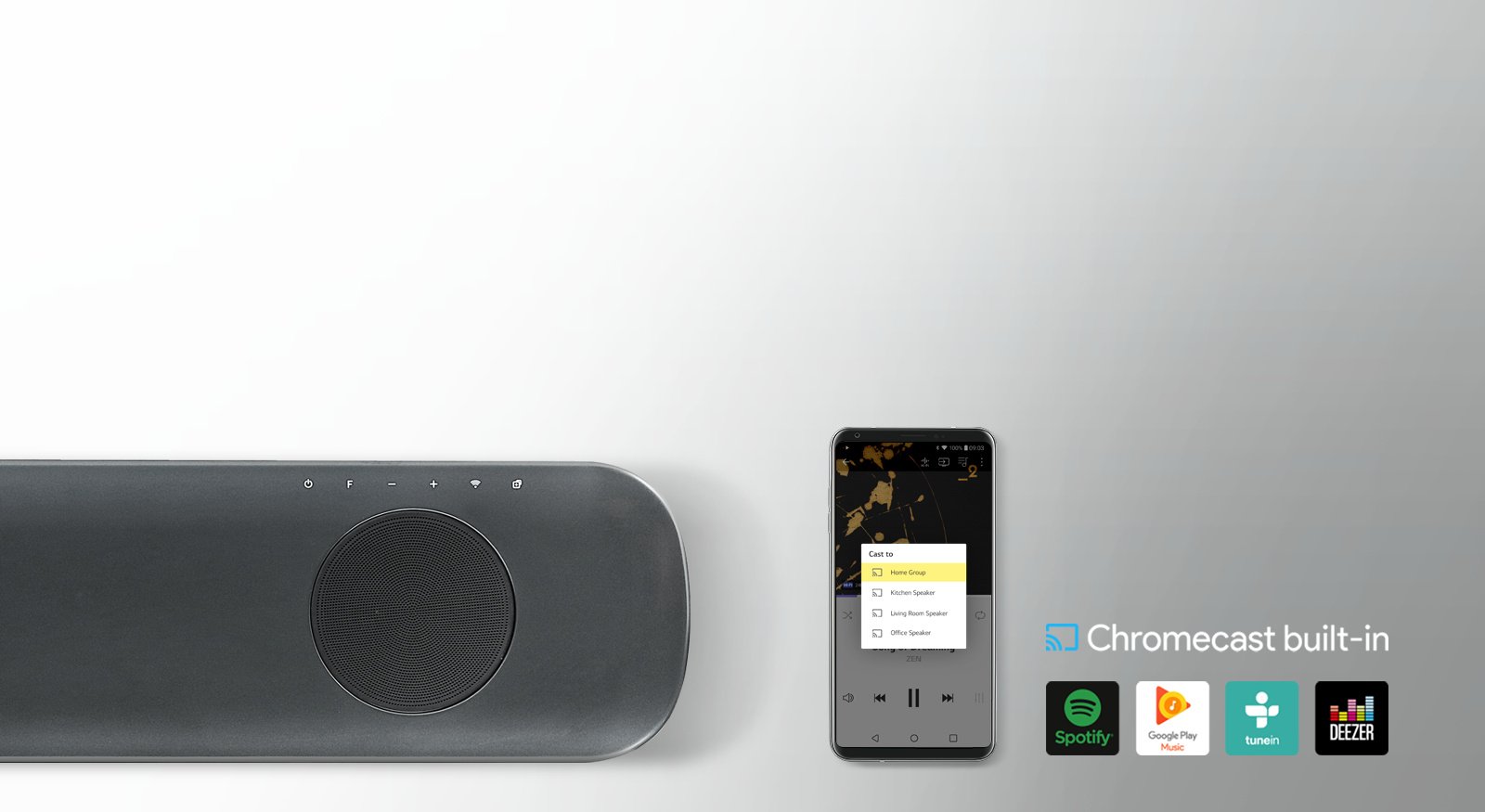 Транслируйте музыку через саундбар беспроводным способом с помощью программ, например Google Play Music. Встроенная функция Chromecast работает со смартфонами, планшетами и др. А устройства с поддержкой Google Assistant * могут транслировать музыку на саундбар с Chromecast по всему дому.
