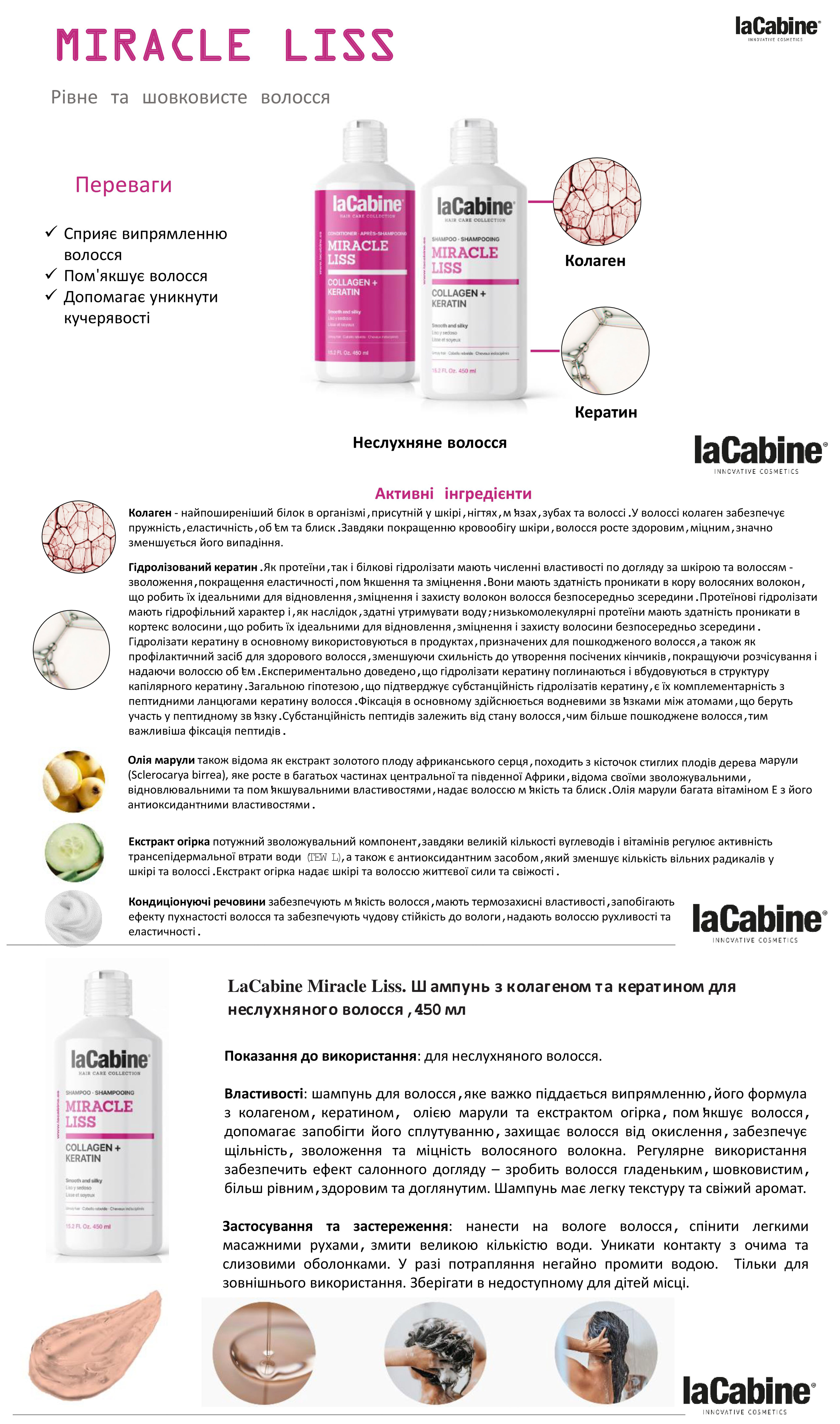 Характеристики Шампунь LaCabine Miracle Liss с коллагеном и кератином для непослушных волос 450 мл