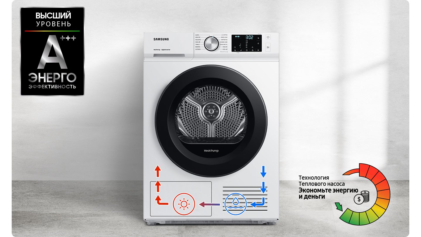 Экономьте деньги и берегите окружающую среду, потребляя меньше электроэнергии*. Тепловой насос обеспечивает энергоэффективный, экономичный и бережный способ сушки вашей одежды. Она имеет класс энергоэффективности A+++, поскольку в ней используется «хладагент» вместо электричества для нагрева воздуха и рециркуляция теплого воздуха, чтобы избежать лишних затрат энергии.
