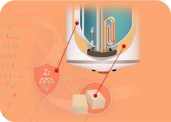 - Внутренний резервуар дополнительно покрыт прочным слоем эмали с содержанием циркония, который предотвращает разрушение поверхности бака.