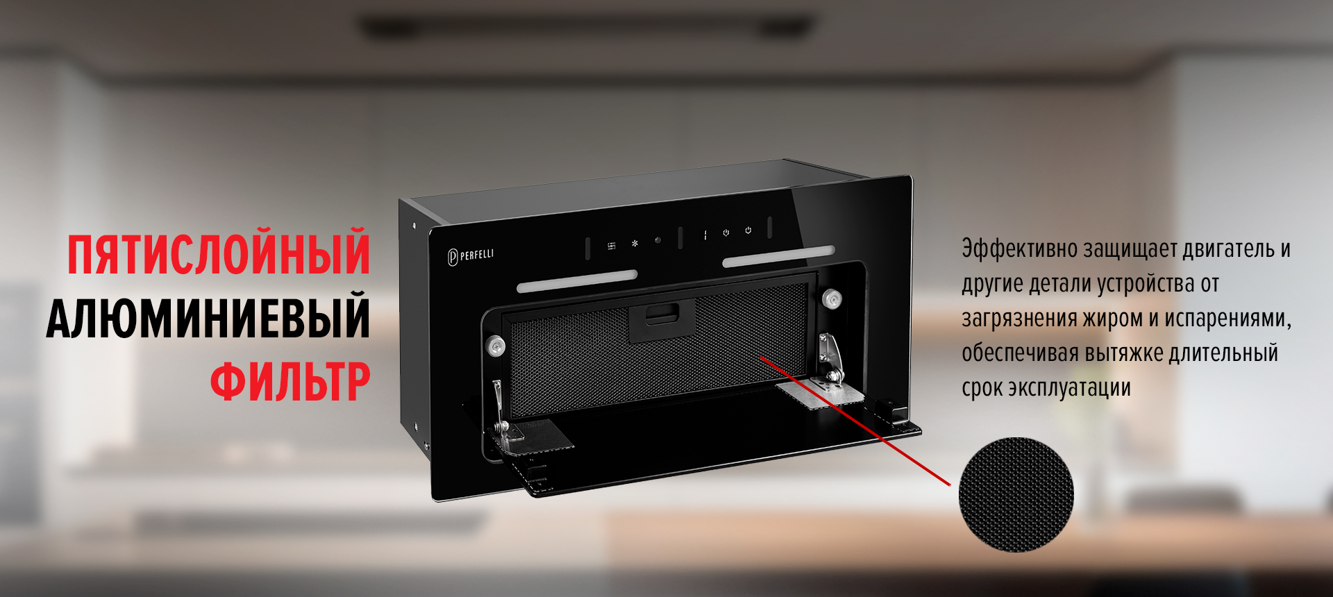 - Пятислойный алюминиевый фильтр, который надежно удерживает копоть и испарения.
