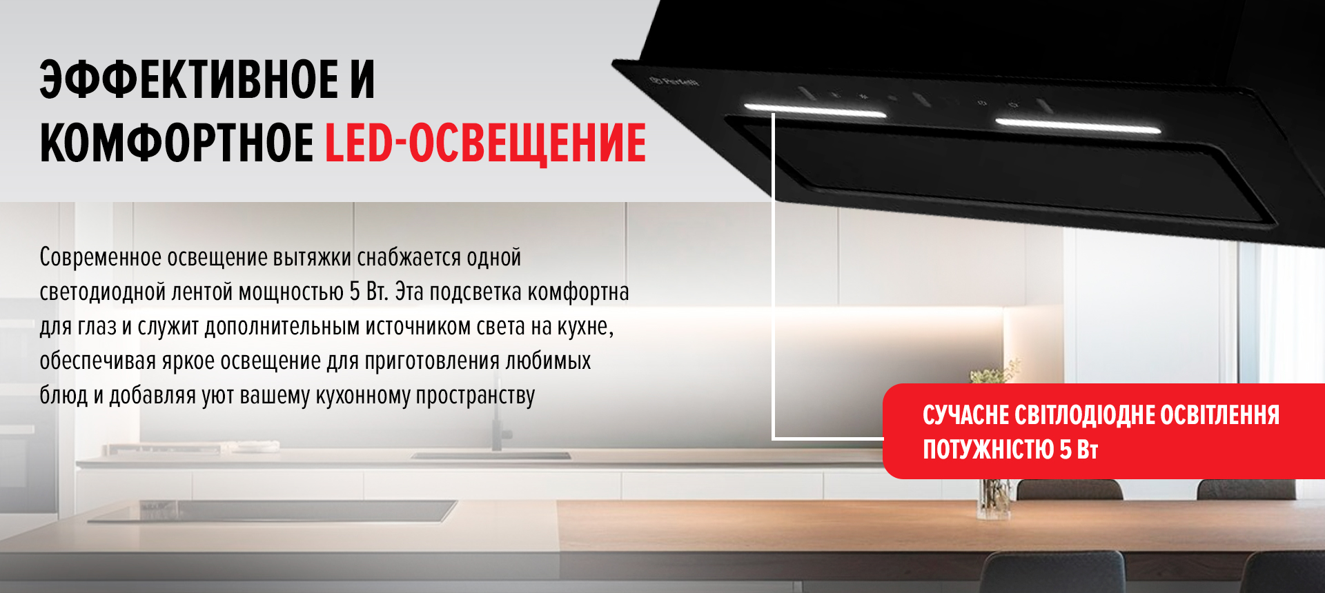 Современное освещение вытяжки обеспечивается одной светодиодной лентой мощностью 5 Вт. Эта подсветка удобна для глаз и служит дополнительным источником света на кухне, обеспечивая яркое освещение для приготовления любимых блюд и добавляя уют вашему кухонному пространству.