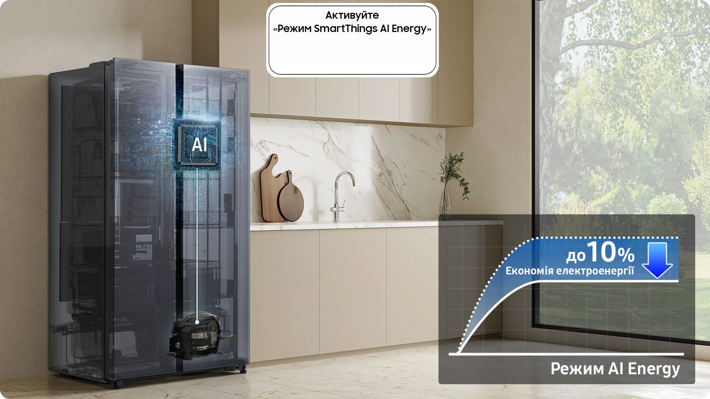 ** Доступно лише для моделей, оснащених системою машинного навчання та AI алгоритмами. Станом на грудень 2024 року, компресор AI застосовується в таких моделях: RM90F/36, RF80F/36, RF70F/36, RF90F/36, RF70F/36, RS90F/36, RB7300, RB6000D, BRB6500D, RT7000K, RT6500D, RT7300D, RT6300F. Перелік підтримуваних моделей може змінюватися. Оцінений рівень енергозбереження на основі AI алгоритму становить 7-11% і залежить від конкретної моделі. Для використання функцій компресора AI Inverter необхідно активувати режим AI Energy у застосунку SmartThings, а також забезпечити підключення до Wi-Fi та мати обліковий запис Samsung.