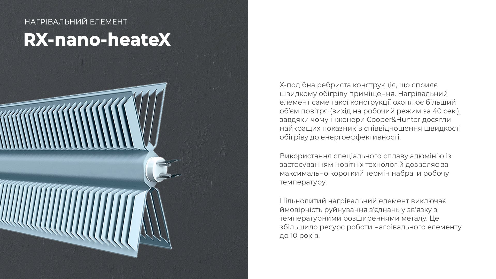 - Нагрівальний елемент RX-nano-heateX - суцільнолита Х-подібна ребриста конструкція, яка сприяє швидкому обігріву приміщення