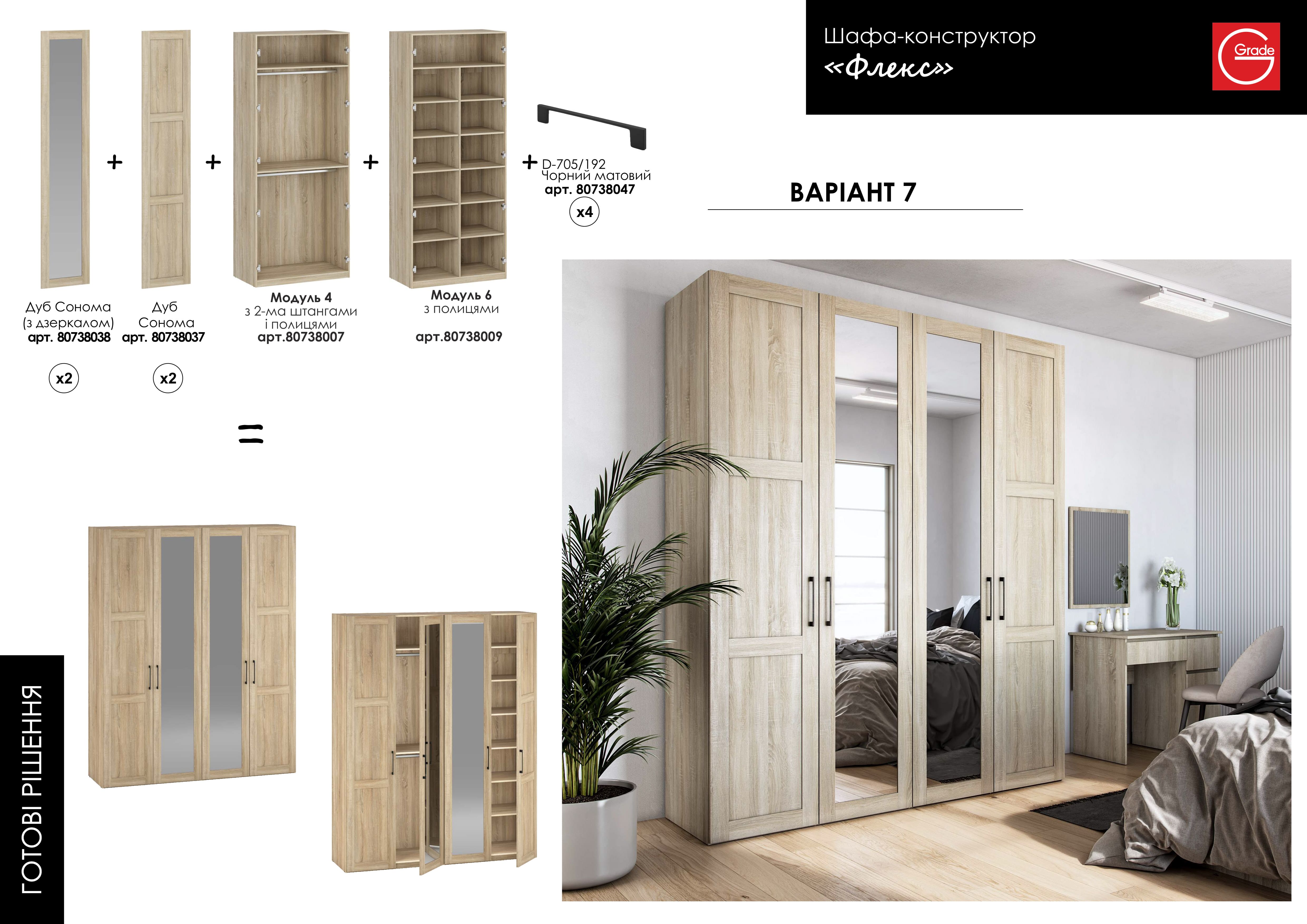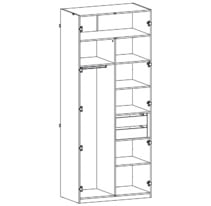 - Корпус шафи Флекс містить одне велике відділення зі штангою для навішування одягу, 7 ніш для зберігання різної ширини та дві шухляди.