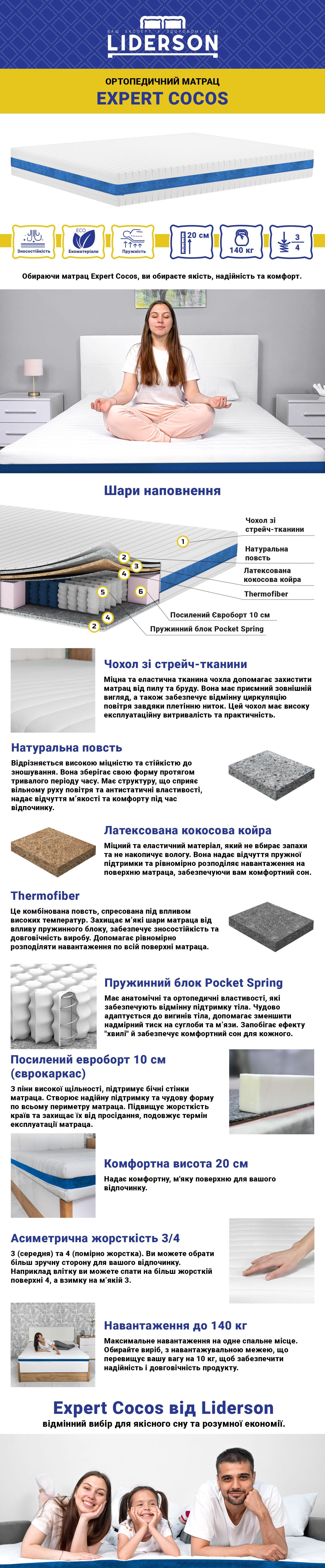 Опис Матрац ортопедичний Expert Cocos LIDERSON 180x190 см