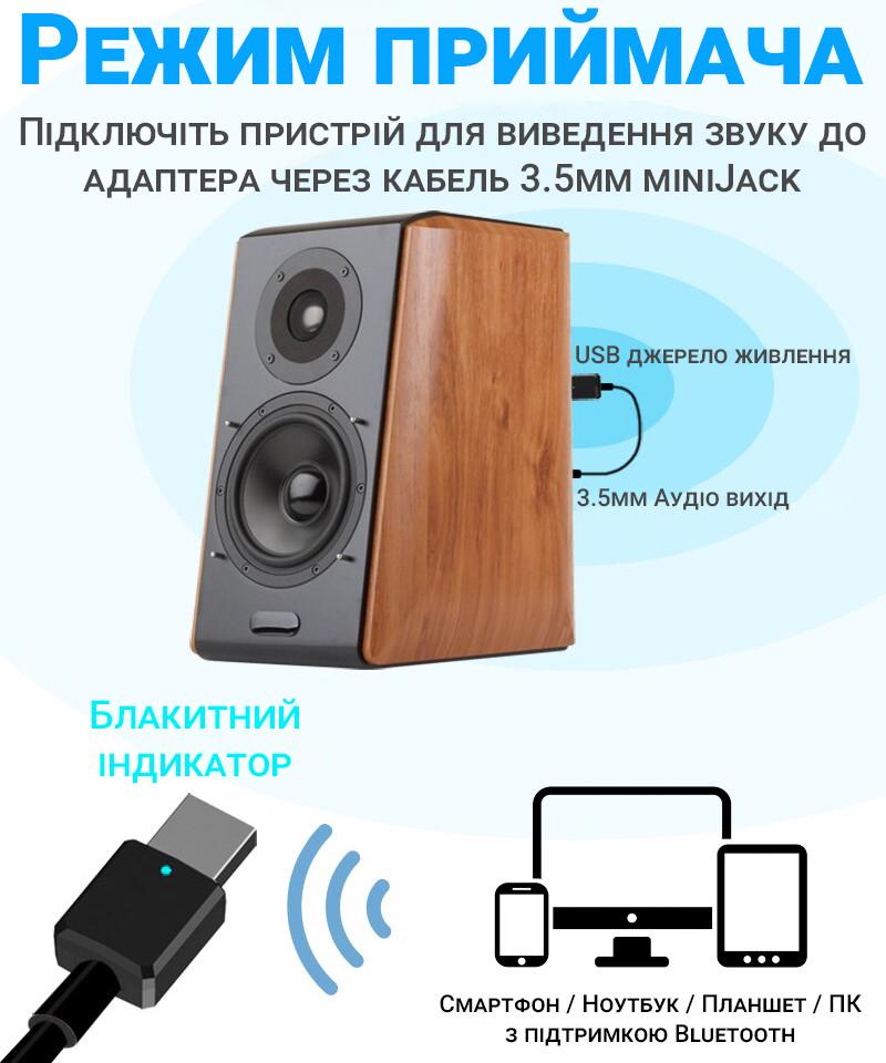 Аксесуар оснащений бездротовим модулем Bluetooth 5,0, що забезпечує стабільну передачу на великій відстані. Для початку роботи потрібно встановити адаптер USB у відповідний порт комп'ютера/ноутбука/колонки для отримання живлення. Після цього слід підключити провід 3,5 мм до перехідника, а зі зворотного боку вставити у пристрій, який використовуватиметься для виведення або захоплення звуку. На корпусі знаходиться світлодіодний індикатор, який допоможе зрозуміти в якому режимі знаходиться адаптер, а щоб змінити його, слід кілька разів по черзі вставити та вийняти аксесуар з порту USB.