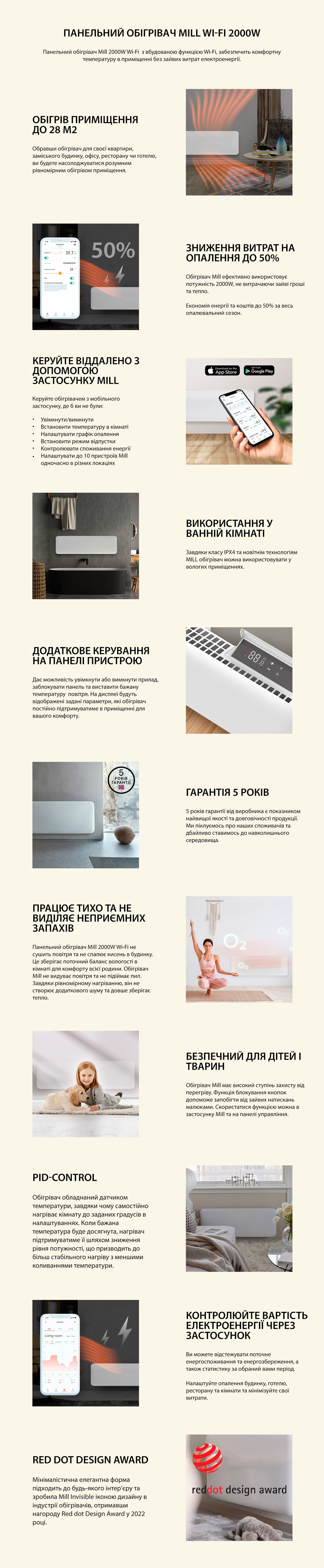 Основні характеристики Обігрівач Mill панельний 2000W WiFi