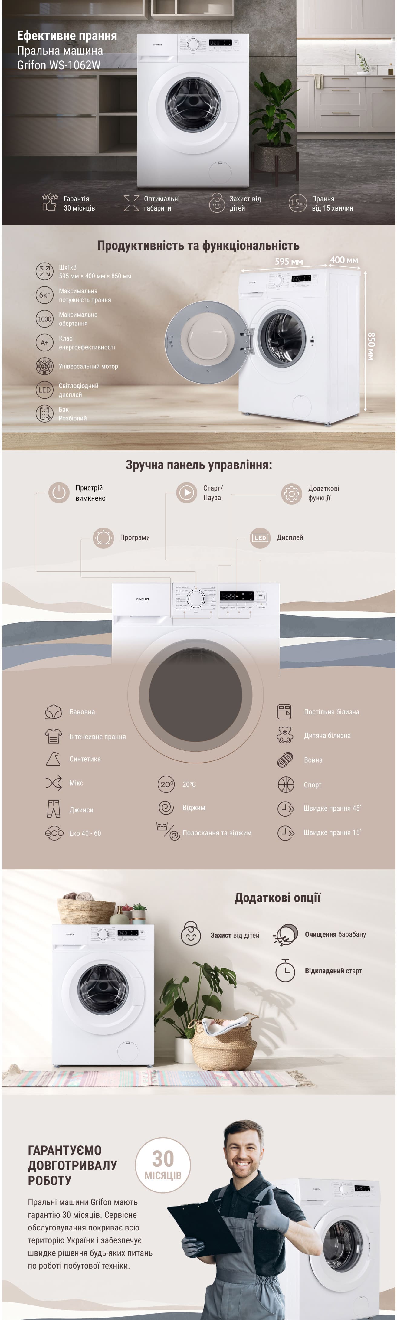 - Затримка: так (24 години) Температура : холодний-20-40-60-90 Швидкість: 0-400-600-800-1000 Додаткове полоскання Попереднє прання Нагадування про очищення барабана Беззвучне прання (Натисніть 3 секунди) Блокування від дітей (комбіноване)