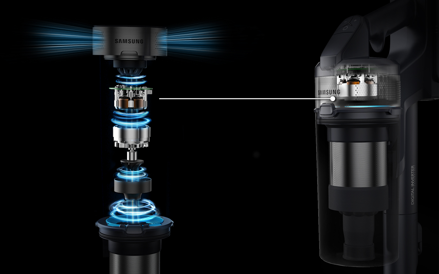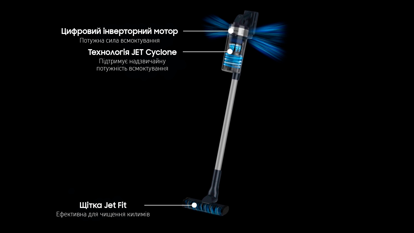 Прибирайте свій дім без особливих зусиль за допомогою легкого управління і рухів. Легкий дизайн забезпечує максимальну зручність використання і зменшує навантаження на зап’ястя. Портативний корпус важить всього 1,48 кг, що на 21% легше*, ніж звичайні пилососи Samsung. Таким чином, ви можете легко прибрати все в своєму домі.