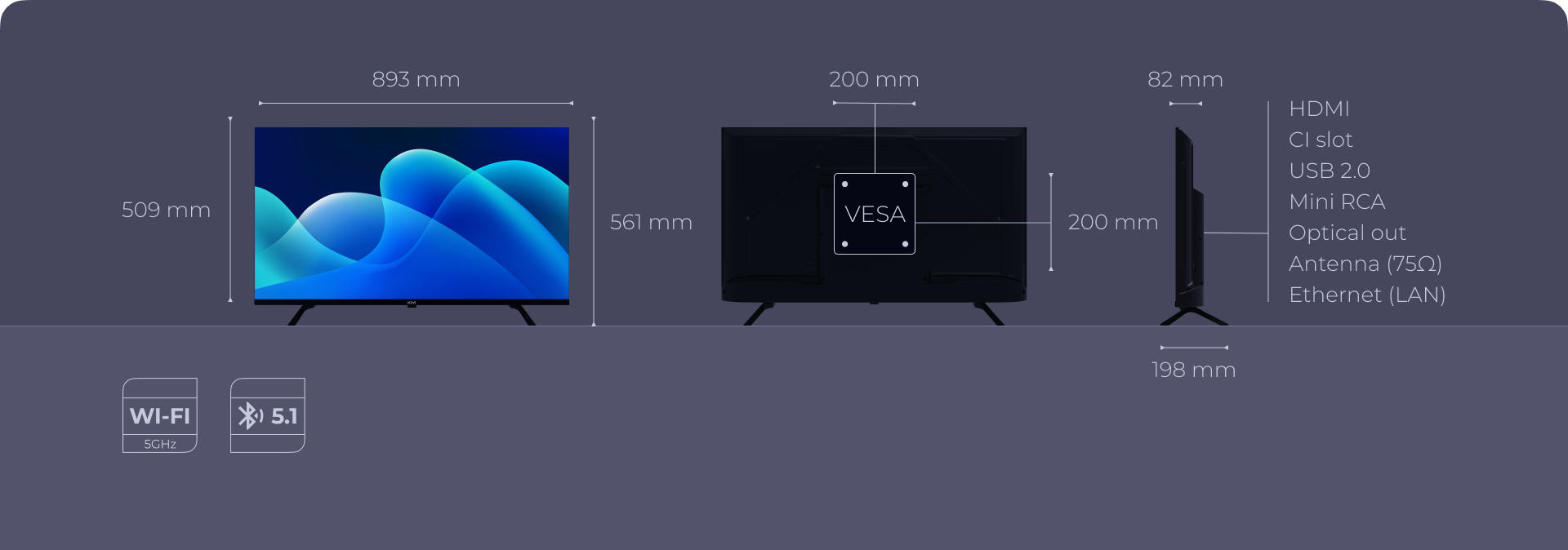- з підставкою: 893 × 561 × 203 мм, 5.3 кг