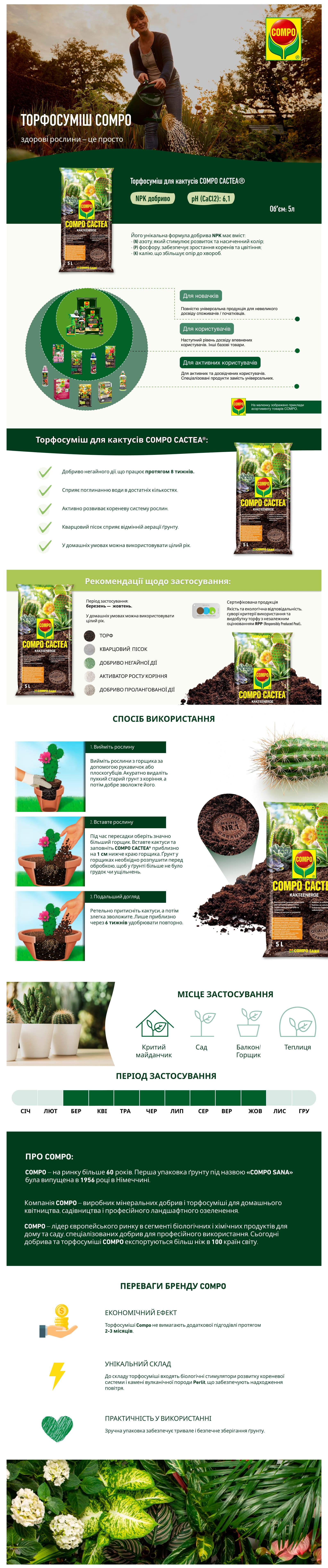 Характеристики Торфосуміш Compo Sana для кактусів 5 л 1221