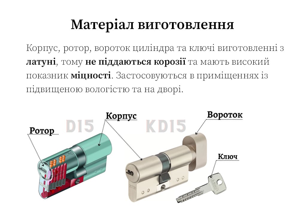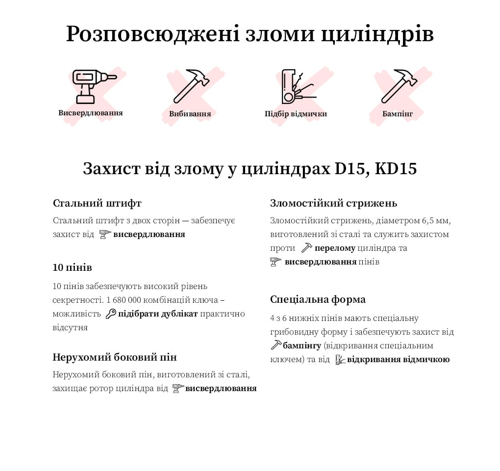 - клас захисту 8 – високий рівень захисту; 10 пінів (нерухомих стрижнів з твердих сплавів) забезпечують високий рівень секретності, 1 680 000 комбінацій ключа; корпус, ротор, вороток циліндра та ключі виготовленні з латуні, тому не піддаються корозії; зломостійкий стрижень, діаметром 6,5 мм, виготовлений зі сталі та служить захистом проти перелому циліндра та висвердлювання пінів; нерухомий боковий пін, виготовлений зі сталі, захищає ротор циліндра від висвердлювання; всі пружини пінів виготовлені з нержавіючої сталі; 6 нижніх активних пінів із загартованої сталі, забезпечують високий захист від злому відмичкою; 4 із 6 нижніх пінів мають спеціальну грибовидну форму і забезпечують захист від бампінга; 4 верхніх пасивних піна з латуні, зчитують профіль ключа; циліндр рекомендується для установки на вхідні двері як в основний, так і в додатковий замок; у комплекті 5 подовжених ключів високої точності нарізки, додатково покритих нікелем для тривалої експлуатації, можливе використання з броненакладкою